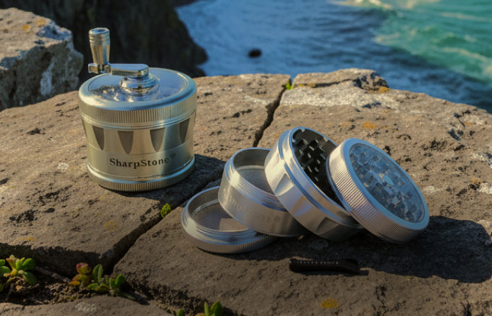 Sharpstone Grinders are made from high-quality anodized aluminum. The raw materials and the metals used in manufacturing all Sharpstone Grinders are carefully selected and are meticulously treated to ensure utmost quality. The aluminum materials are crafted from solid aircraft grade rods which are then fabricated using the latest CNC machining technology. This is why all Sharpstone Grinders come out polished and smooth. Sharpstone’s promise of quality is emanated in every item that leaves the production line. Unlike other grinders that may have manufacturing defects, uneven edges, and other manufacturing imperfections, Sharpstone Grinders are crafted to exceed standards. Even minor flaws can cause injury to you and your hands should you slip and scrape yourself with these deformities while grinding. Superior craftsmanship is what sets our grinders apart from the competition, manufacturing precision is obvious in every Sharpstone Grinder. The drop holes are perfectly round allowing even amounts of ground herbs to fall in place. That's why the end product of each Sharpstone Grinder come out as even and as uniform as possible. Because of the precision achieved using computer numerical controls as well as the durability of the aircraft grade aluminum used in manufacturing, the internal components, like the grinding teeth of each Sharpstone Grinder, become one of the best in the business. It can hack and slash through even the most stubborn nugs of herbs allowing you to enjoy a smooth grinding experience, whoever said grinding should be a labor of love? Sharpstone Grinders take today’s advancement in technology and put it to proper use. You'll enjoy the razor-sharp cutting blades which allows utmost efficiency and efficacy. No other weed grinder can cut through your herbs as swift and as effortlessly as Sharpstone Grinders. To add to that, each piece is held together by strong rare earth neodymium magnets. This allows for exceptional closure and Sharpstone Grinders know exactly why that is important. Having a sealed weed grinder keeps your herbs fresh, the aroma and the flavor of the ground material is locked inside the herb grinder, never allowing a whiff of the herb to escape the herb grinder. It also keeps molds, mildew, and other contaminants away from your herbs. You can use it to store your ground botanicals for a short amount of time. This also means that you’ll never run into spillage, you’ll never have to waste ground herbs anymore. Sharpstone Grinders ensure that you get to maximize your plant matter by keeping them safe inside not like other cheap weed grinders that may open accidentally when you keep it inside your bags. Sharpstone Grinders made to please, thin poly rings are attached to the grinders to ensure smooth grinding, the kind that feels like you’re milling cotton instead of herbs. These thin poly rings reduce friction which relieves stress from your wrists by reducing the strain it requires to turn the herb grinder. To preserve the aesthetic quality of each product, Sharpstone Grinders anodize each weed grinder allowing it to resist virtual manifestations of minor wear and tear. Smudges and other marks of minor degeneration can be prevented through anodization. Through anodization the surface of each weed grinder becomes tough and durable with high resistance to corrosion. It naturally coats the aluminum with oxide that results to a non-reactive substance – fit for an herb grinder. Each weed grinder is made with stainless steel pollen catcher so the pollen won’t be contaminated by rust and other oxidized material that may contaminate and spoil the herbs and the pollen. Sharpstone Grinders are made to be the solution for all your grinding needs. That’s why select items include pollen scrapers to help you collect the pollen sifted from the ground material. You no longer have to look at wasted pollen that just end up at your fingers. You can use the collected pollen for edibles and even add them to your normal botanical brew. Throw in a pinch of pollen to help increase the potency of your sessions. Select Sharpstone Grinder products also come in a protective carry pouch so you can travel with your Sharpstone Grinder safely and in style. It’s kept sheltered and inconspicuous, away from the prying eyes of bystanders and onlookers who condemn what they don’t understand. A Sharpstone Grinder is the ideal solution for those looking for a high-quality weed grinder at a reasonable cost. Sharpstone Grinders are ergonomic and have a form and a design that allows you to use it many times without having to put it down just so you can rest. Sharpstone Grinders let you grind to your heart’s content.